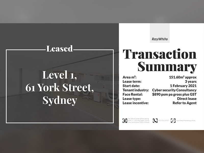 Area m²: 151.6m² approx Lease term: 3 years Start date: 01/02/2021 Tenant industry: Cyber Security Consultancy Face Rental: $890psm pa gross plus GST Lease type: Direct lease Lease incentive: Refer to Agent