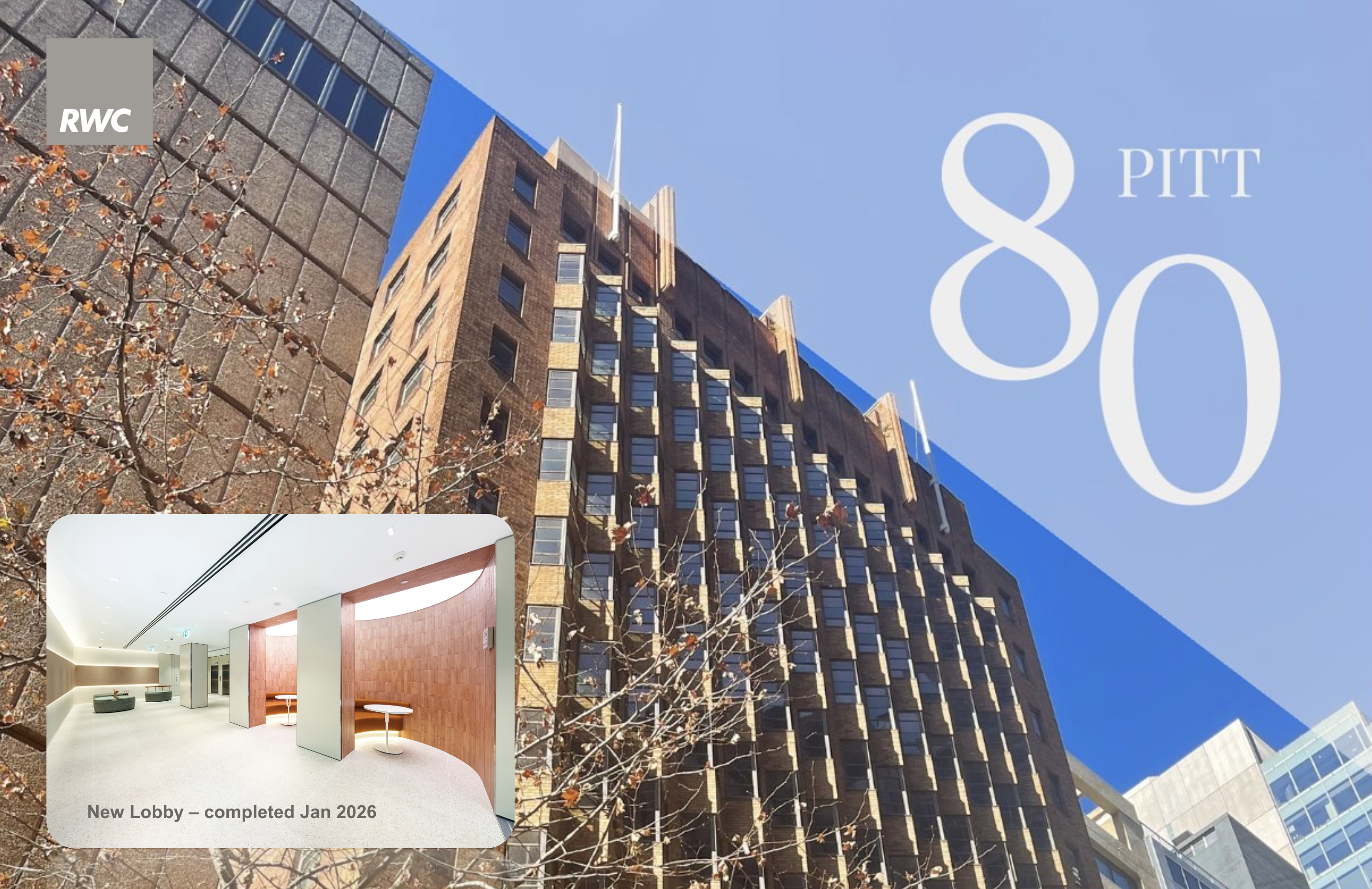 Modern office space meets Pitt St Art Deco heritage. Extensively refurbished building services and bathrooms. New ground lobby experience (2026). Basement EOT. On-floor M/F & DDA bathrooms. Basement EOT/showers. Martin Place proximity. Join multinational tech firm Apple as an 80 Pitt St tenant.