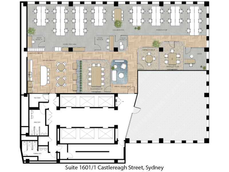 - 38 desks, plus 6p collaboration bench, 3 focus rooms