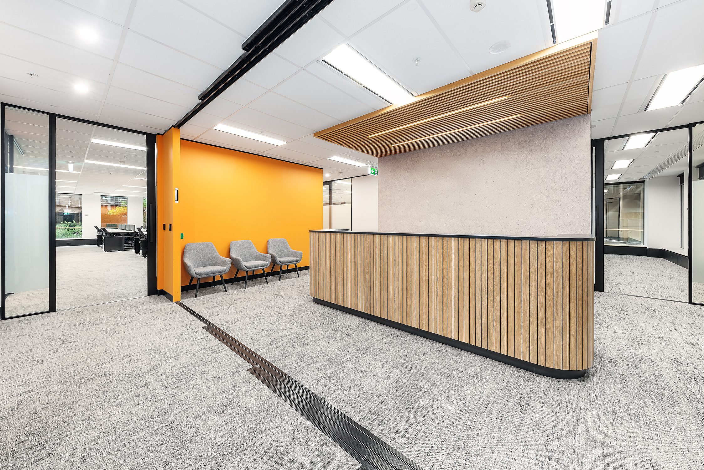 - Full floor with large reception area, 40 desks, 3 focus rooms